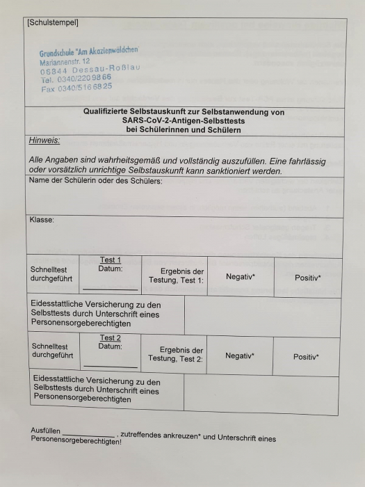 Liebe Familien, bitte beachten Sie die Regelung, dass Ihr Kind nur dann am Unterricht teilnehmen kann, wenn es täglich den aktuellen und unterschriebenen Nachweis über ein negatives Testergebnis mit sich führt (siehe Elternbrief). Der Nachweis wird am besten im Hausaufgabenheft aufbewahrt. Er steht auch hier zum Ausdruck bereit.